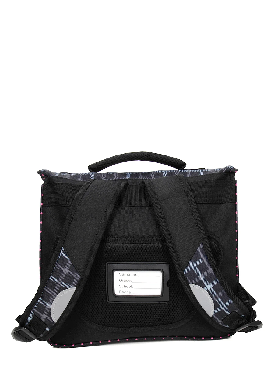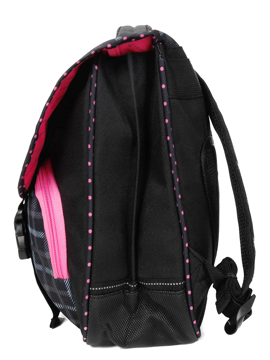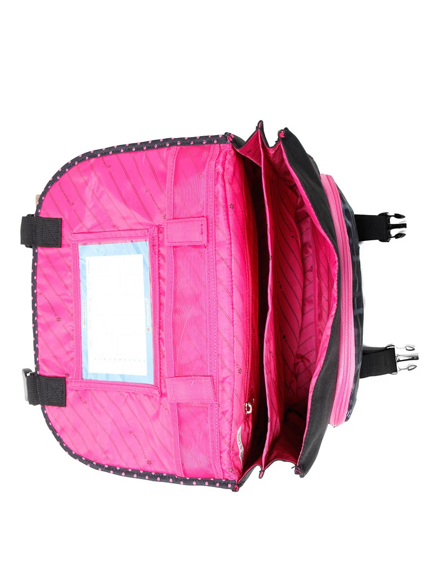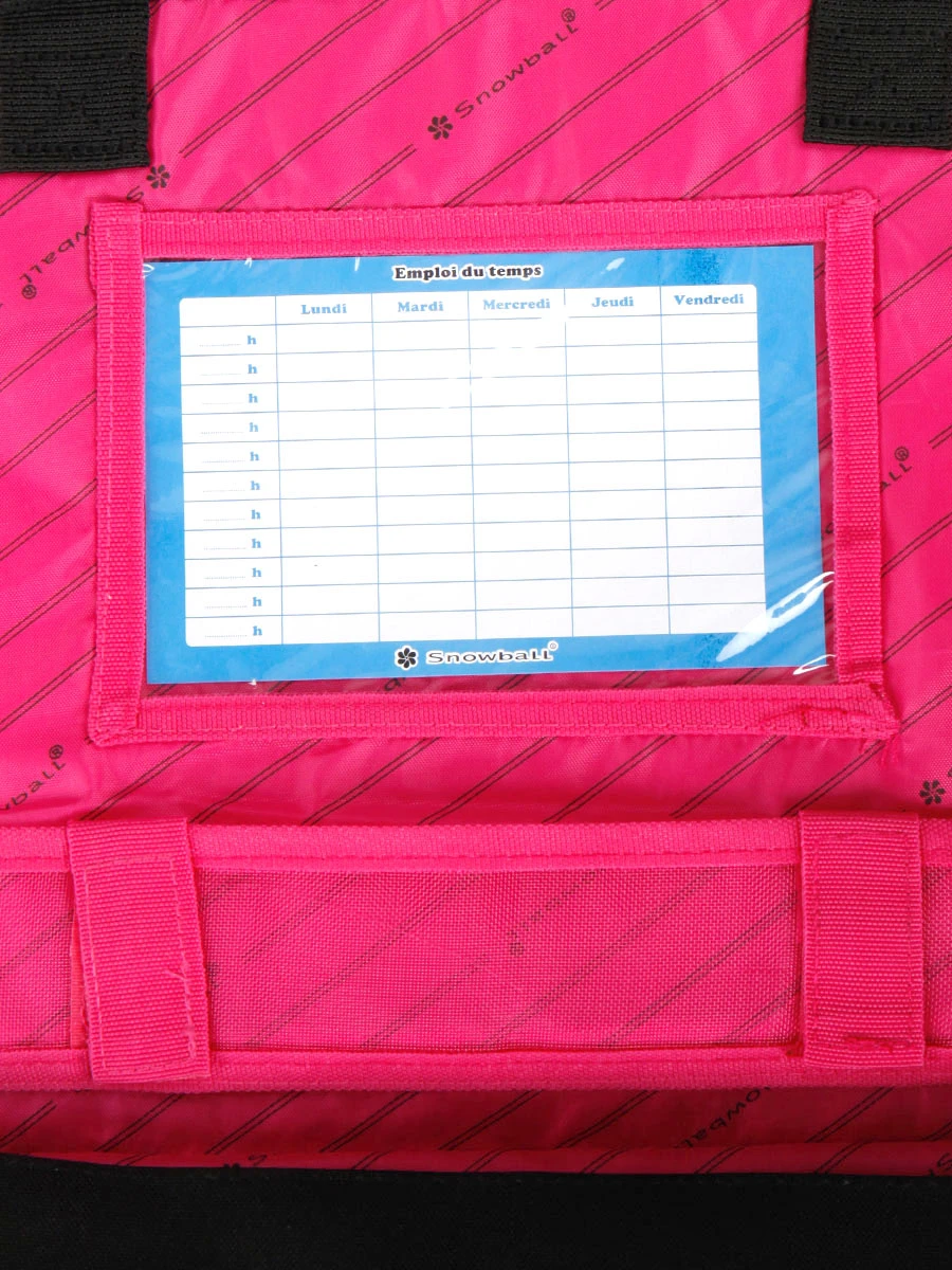 Dans le cartable Snowball Romantique 35 cm, les deux compartiments sont doublés pour en faciliter l’entretien et compatibles avec le format A4. On peut ainsi sérier classeurs, pochettes, trousse, agenda. Une petite poche intérieure zippée permet d’y mettre ses clés, un porte-monnaie ou encore un pass pour les transports. A l’extérieure une autre grand poche à zip offre un espace de rangement supplémentaire pour les petits accessoires ou un goûter par exemple. On note le détail adorable de la tirette en forme de papillon. Le cartable se ferme à l’aide d’attaches à tucks et sous le rabat se trouvent porte règle et porte planning. Enfin, un petit porte étiquette est situé dans le dos pour diminuer le risque de perte.